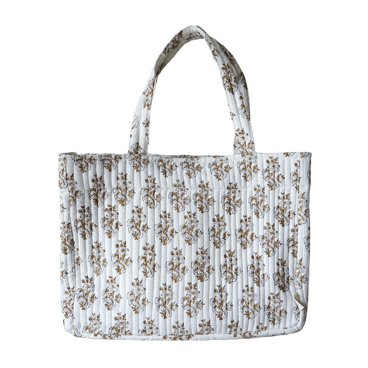 On adore ce grand cabas en gaze de coton matelassée imprimée au tampon de bois avec un joli motif floral en coloris safran . Il sera parfait aussi bien en ville qu’à la plage.