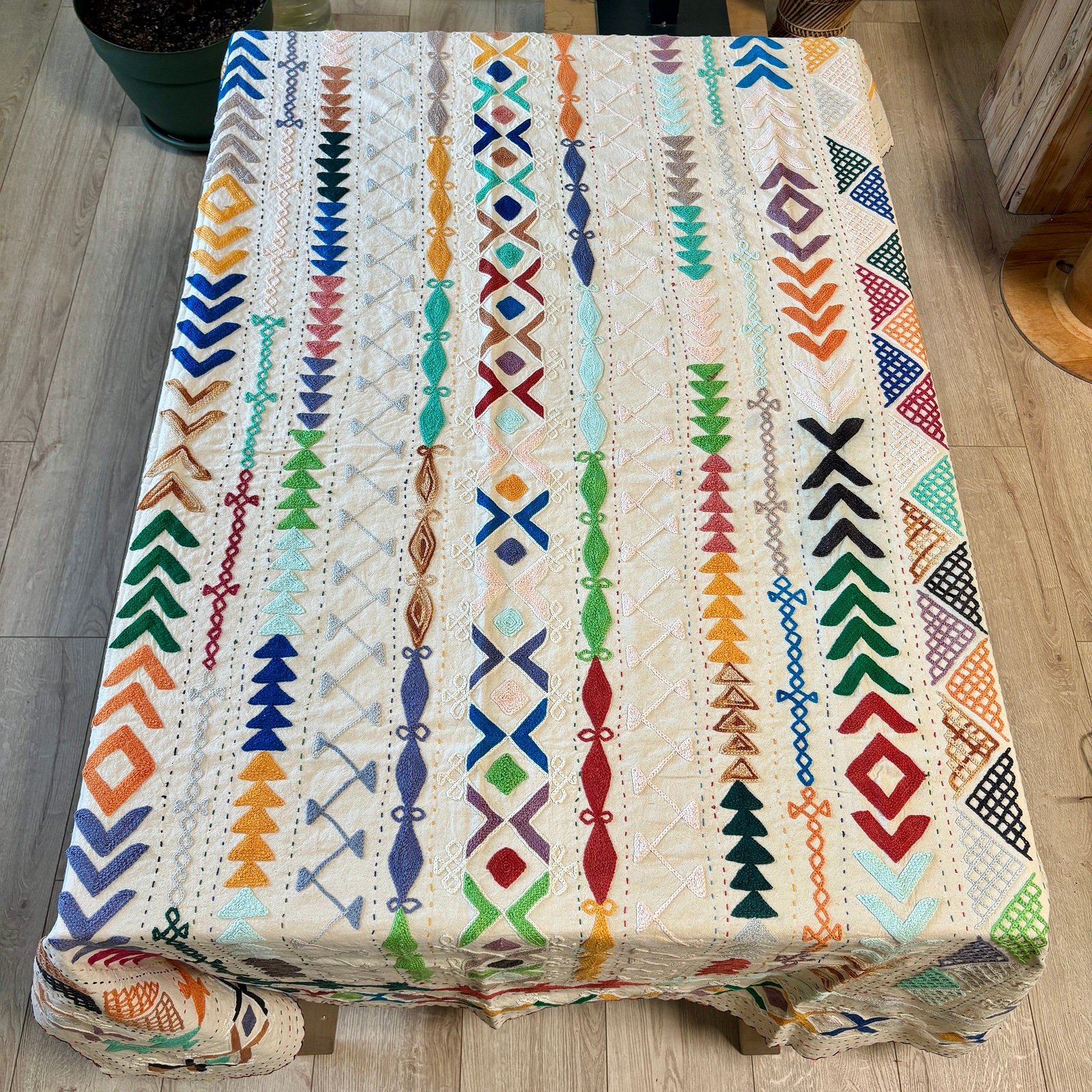 Splendide tenture en toile de coton épaisse entièrement brodée à la main de motifs géométriques multicolores Suzani. Le tour est également entièrement orné de surpiqûres colorées réalisées à la main