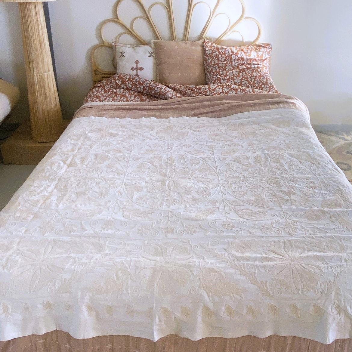 Splendide jeté Suzani entièrement brodé à la main avec des broderies de coton beige sur toile de coton épais blanc cassé. Le résultat est une pièce superbe, très douce et intemporelle, qui pourra être utilisée en couvre-lit , en tenture murale mais qui peut aussi devenir une magnifique nappe pour des tables de fête en toutes saisons.