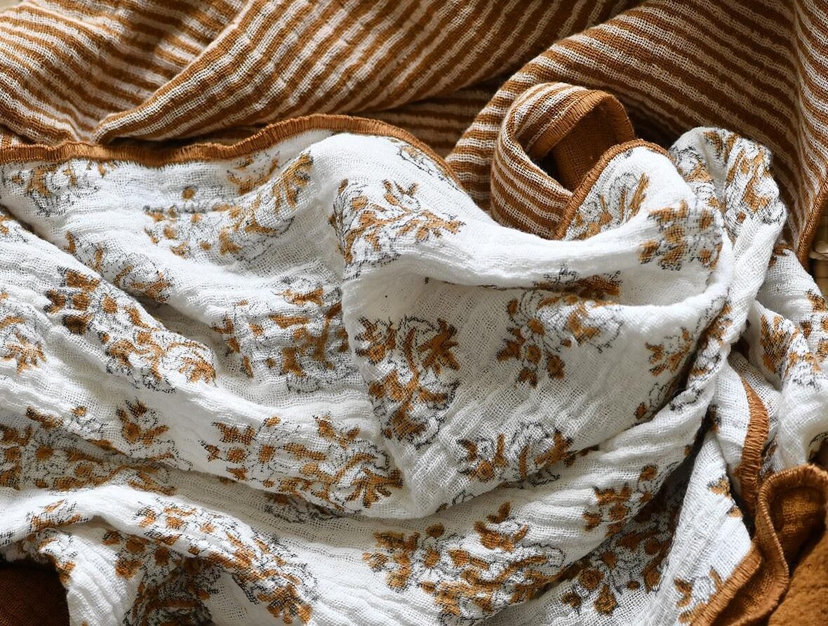 2 jolis torchons en double gaze de coton avec une impression au tampon de bois et finition bourdon. Légère et absorbante la gaze de coton sèche rapidement.