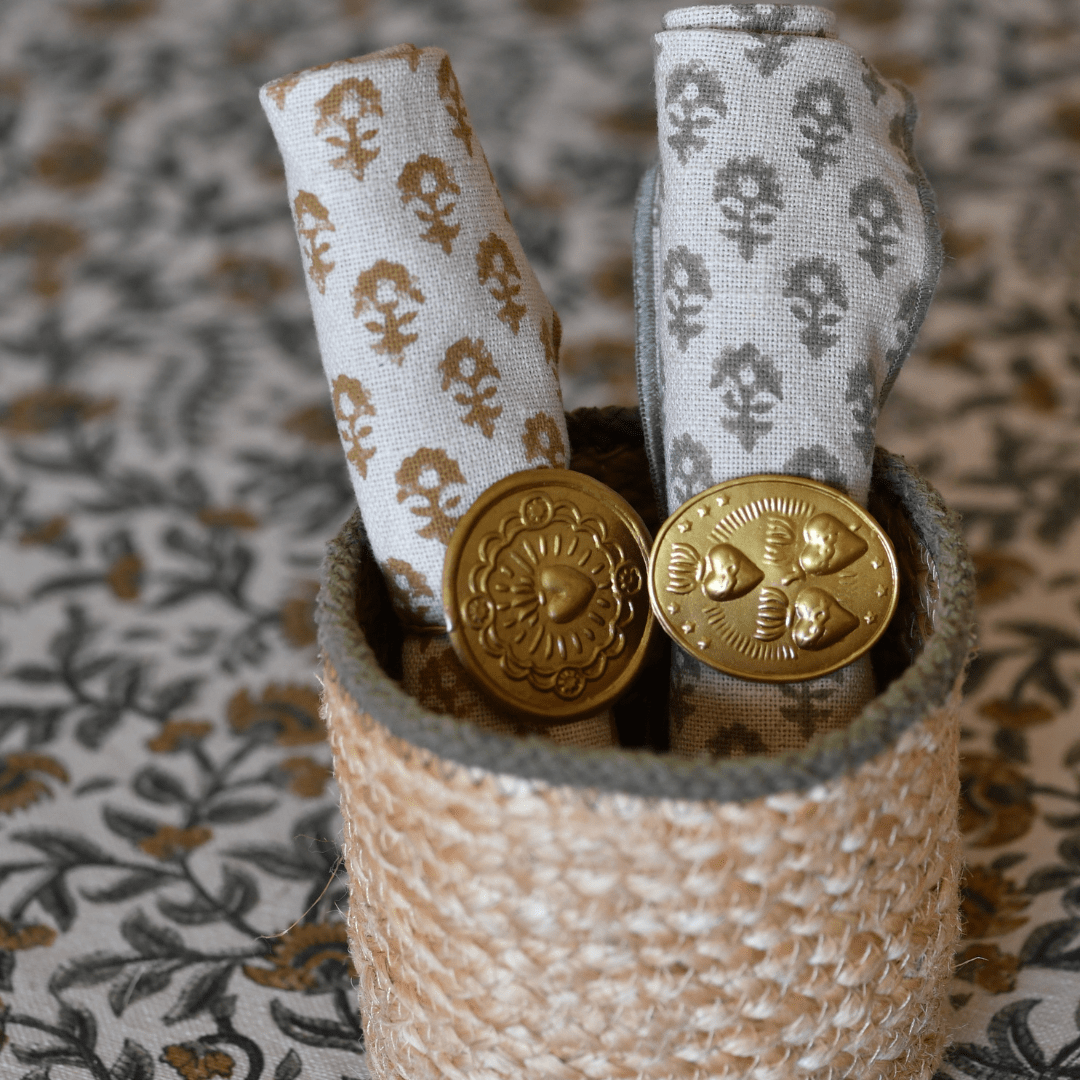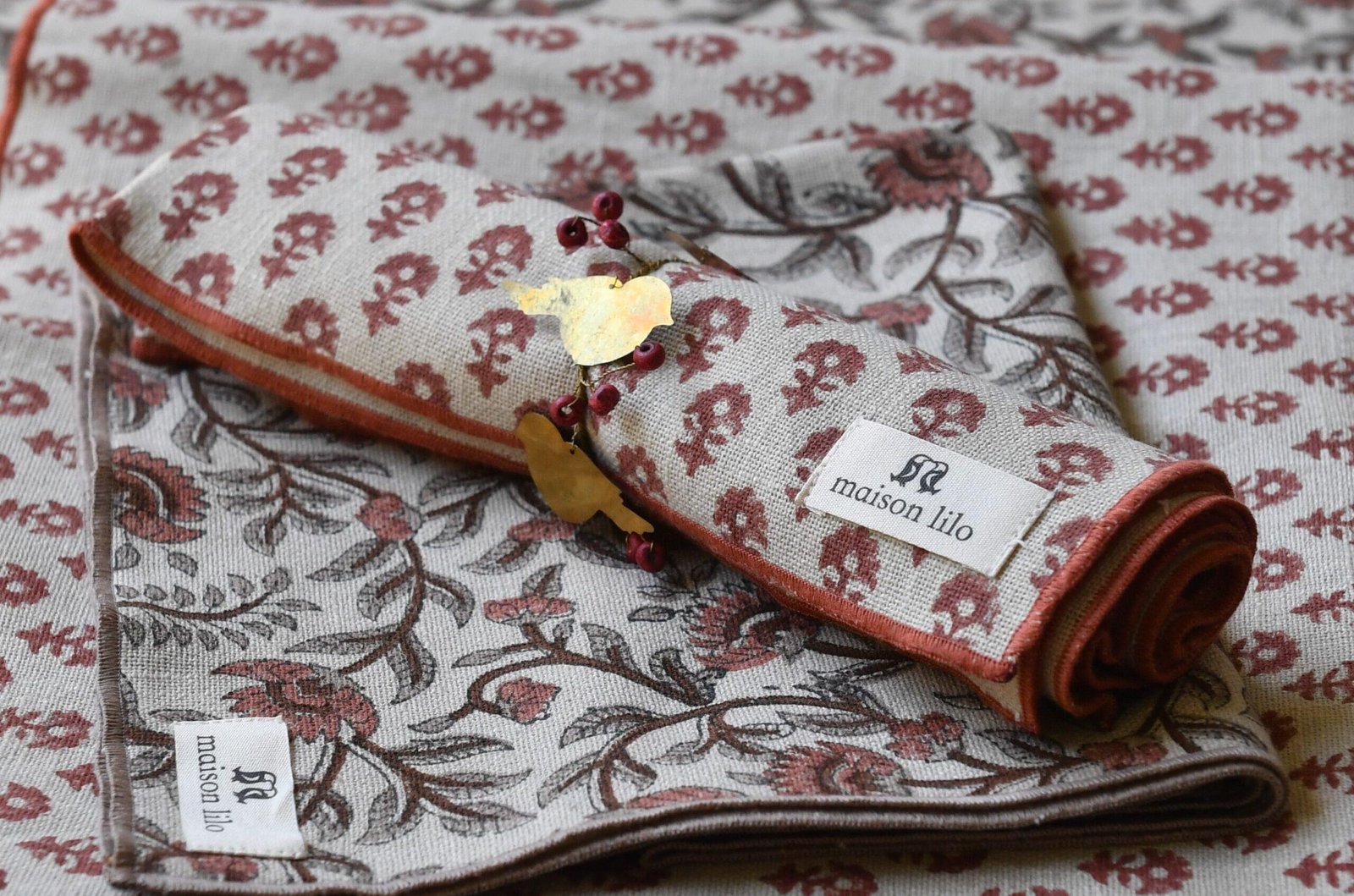 Serviettes en toile de coton épaisse imprimées au tampon de bois dans notre atelier à Jaipur, finition surpiqûre bourdon.