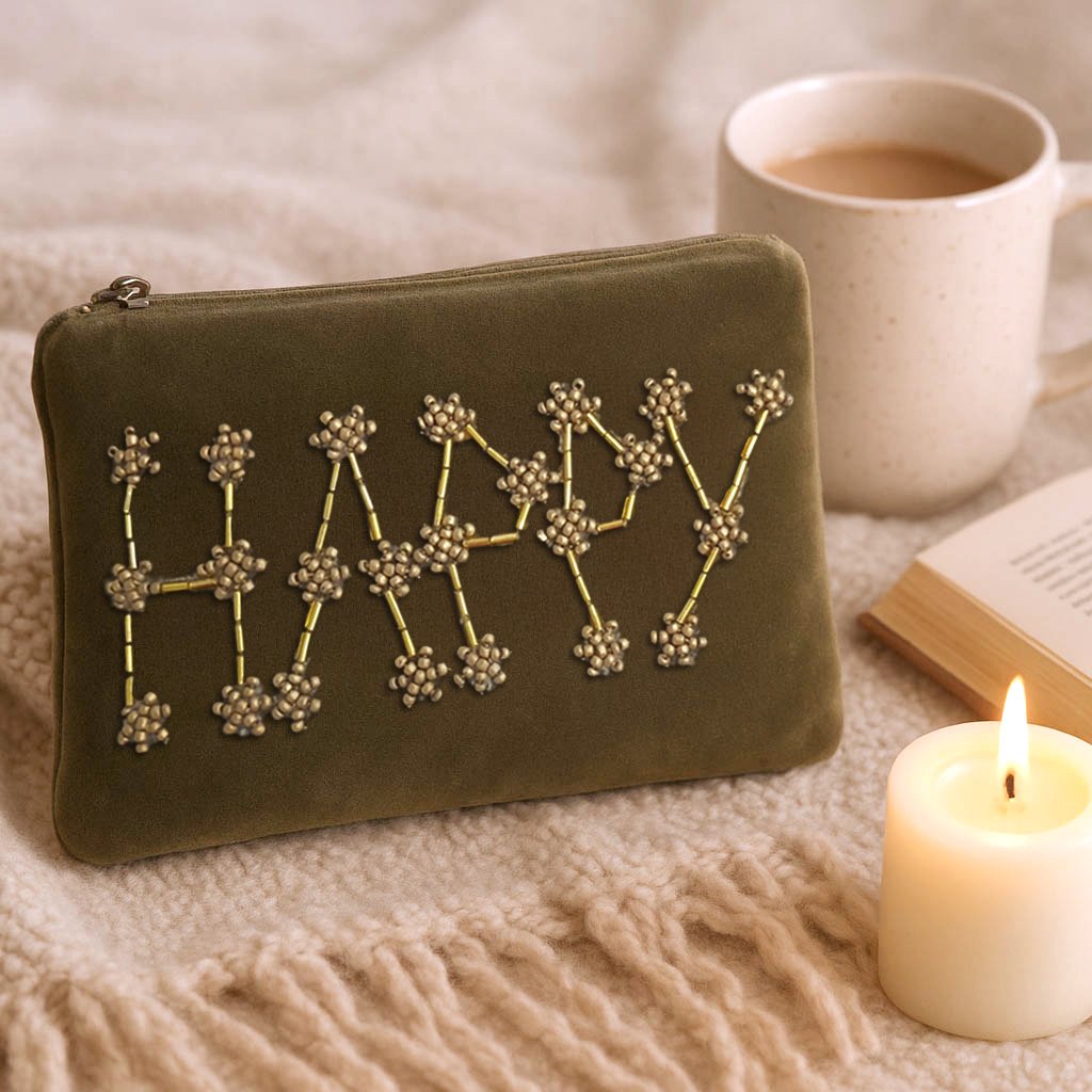 Format porte-monnaie ou porte-carte, c’est une pochette plate en très beau velours (100% coton) coloris kaki-vert de gris, brodée d’une constellation d’étoiles en sequins, perles de laiton et fil doré “H A P P Y”.
