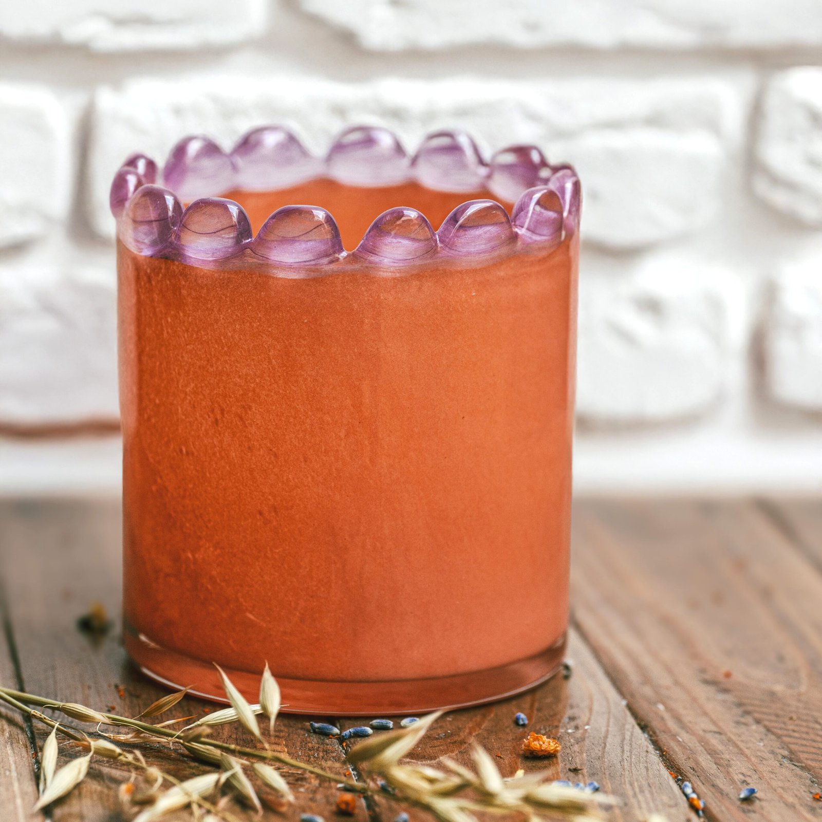 Photophore en verre soufflé bouche artisanalement dans un magnifique coloris vitaminé corail-pêche coloris moka orné d’un bord de perles de verre couleur lavande. Il sera du plus bel effet en déco pour apporter une touche vitaminée et pour diffuser une douce lumière tamisée avec une bougie