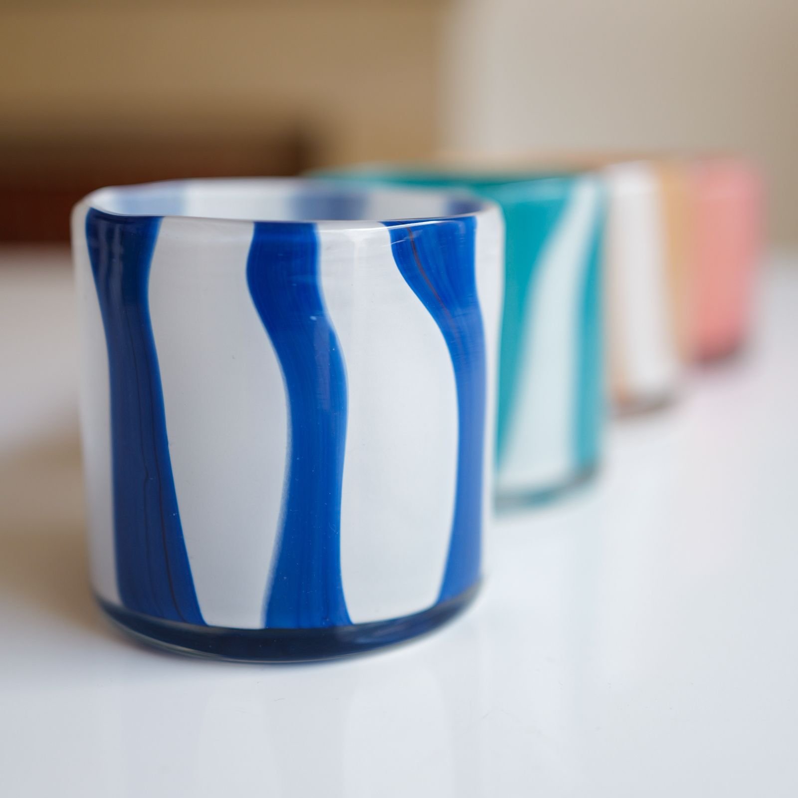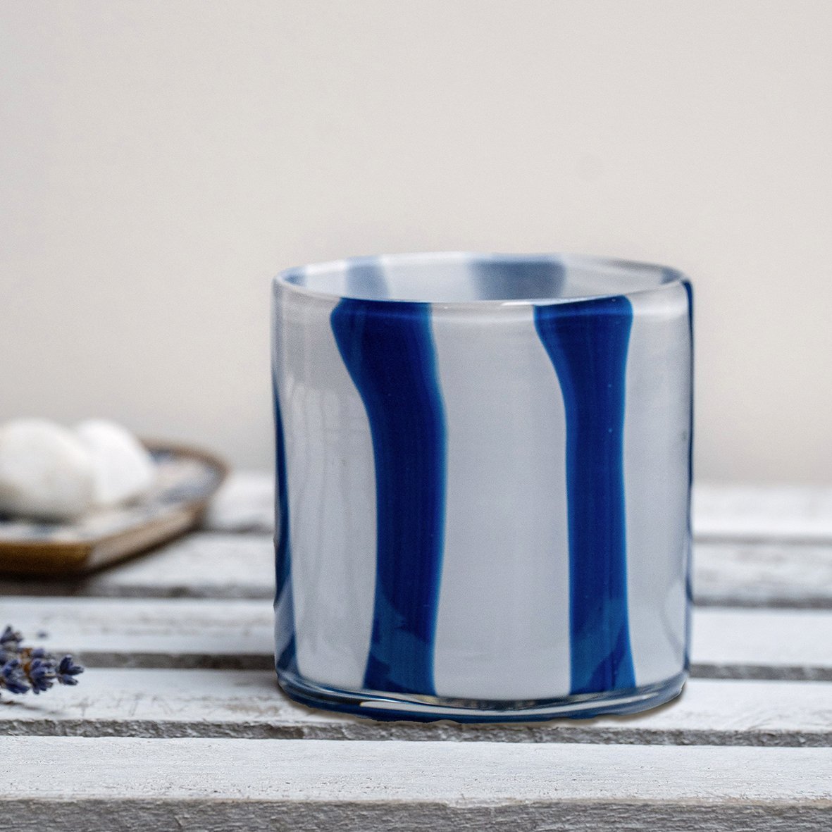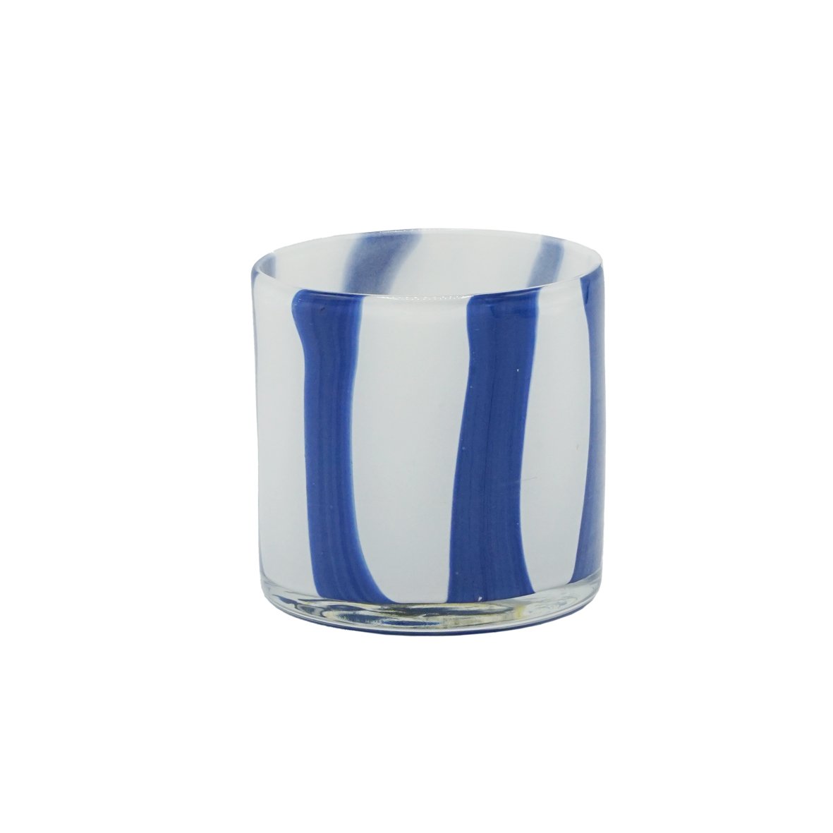 Photophore en verre soufflé bouche artisanalement dans un joli coloris marine opaline avec rayures blanches