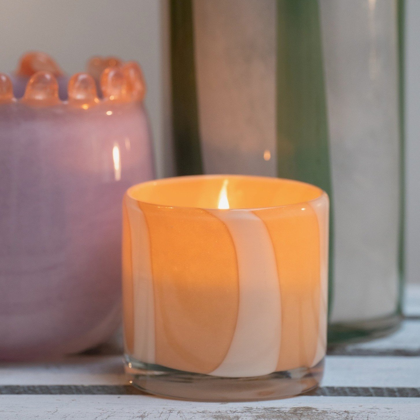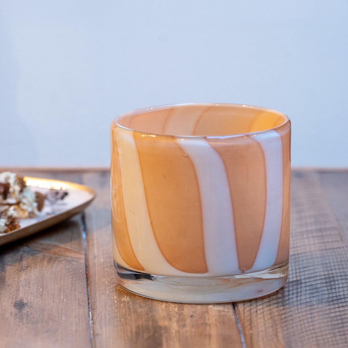 Photophore en verre soufflé bouche artisanalement dans un joli coloris sable opaline avec rayures blanches