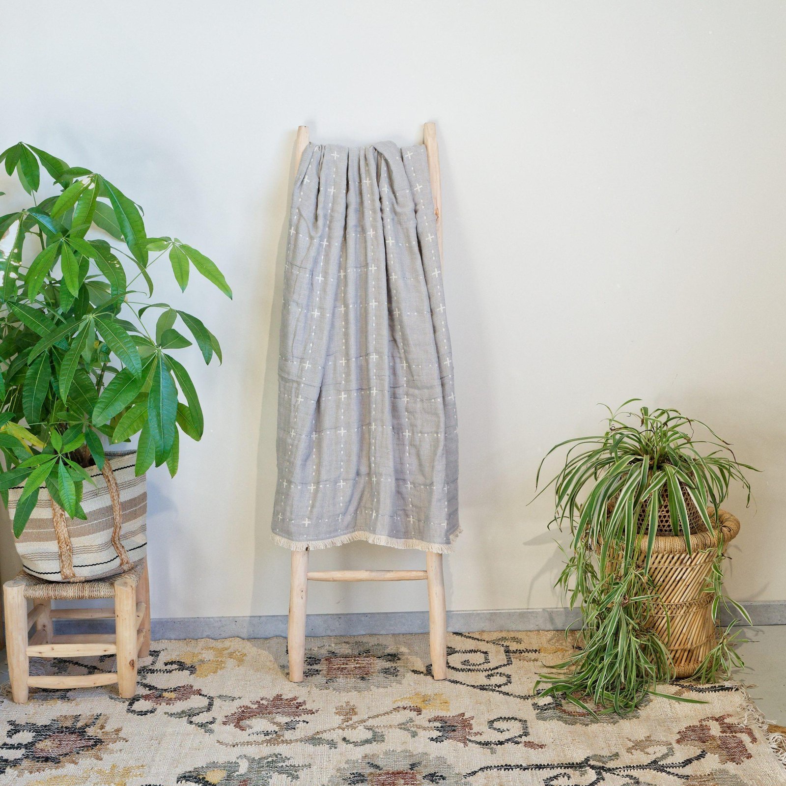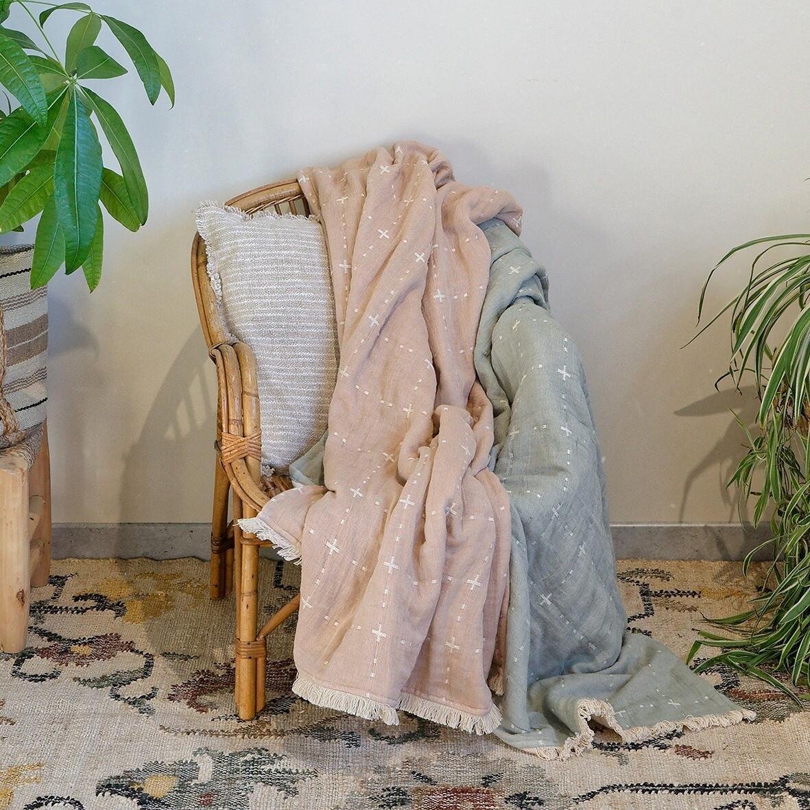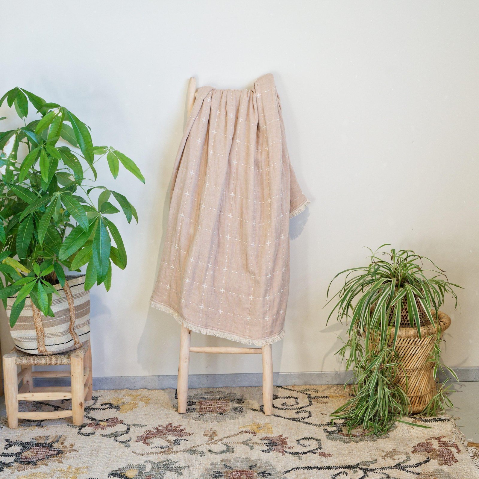 Très beau plaid en gaze de coton légèrement molletonnée et tissage jacquard , finition bord franges sur 2 côtés. Coloris intemporels et doux