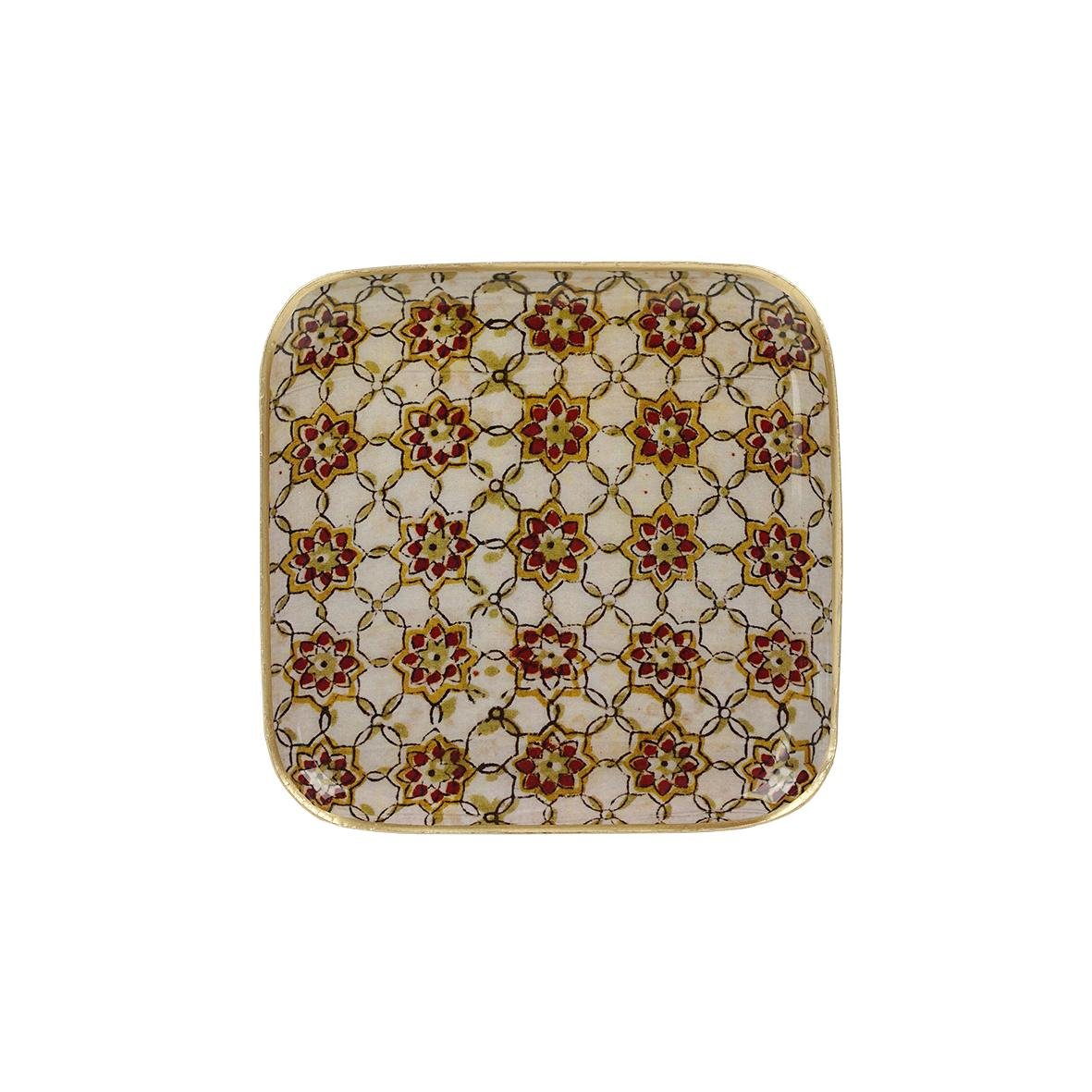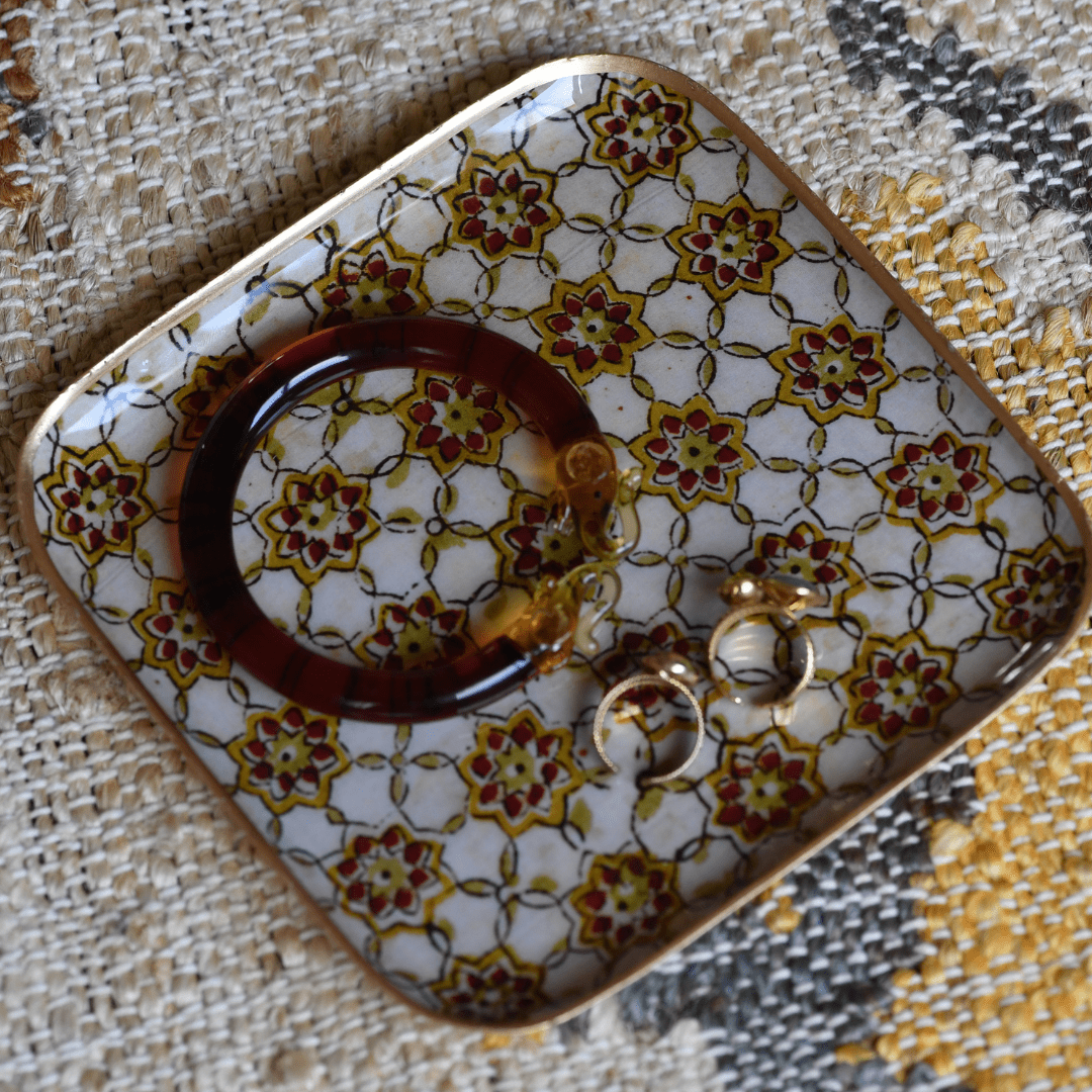 Avec son décor inspiré des carreaux de faïence marocains, ce joli plateau carré en métal émaillé apportera une touche originale en déco, que ce soit comme vide-poches ou pour servir thé ou café. Face arrière dorée, bordure dorée peinte à la main.