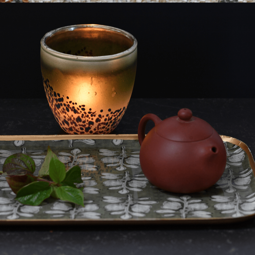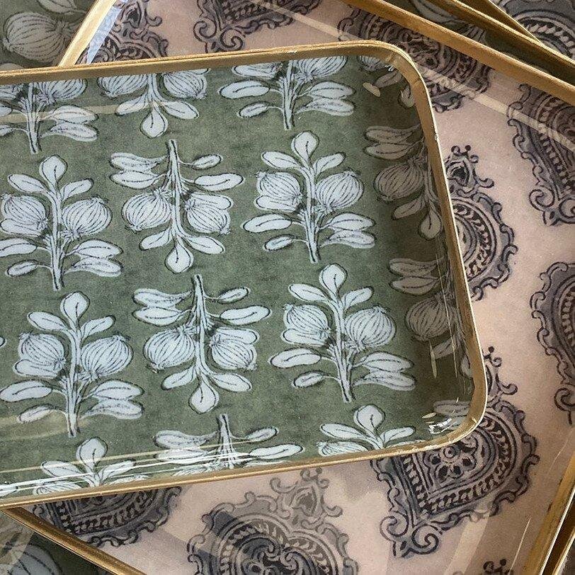 le motif Alhambra qui représente une branche de grenadier est inspiré des motifs traditionnels de l’empire moghol.  Motif iconique de notre collection textile, décliné ici dans notre collection de plateaux métal. Face arrière dorée