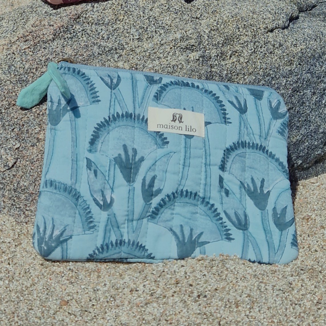 Pochette matelassée en coton imprimé artisanalement au tampon de bois d’un doux motif de fleurs de papyrus d’inspiration art deco. Elle sera parfaite pour accueillir tous vos essentiels maquillage et beauté et se glissera facilement dans un sac ou une valise.