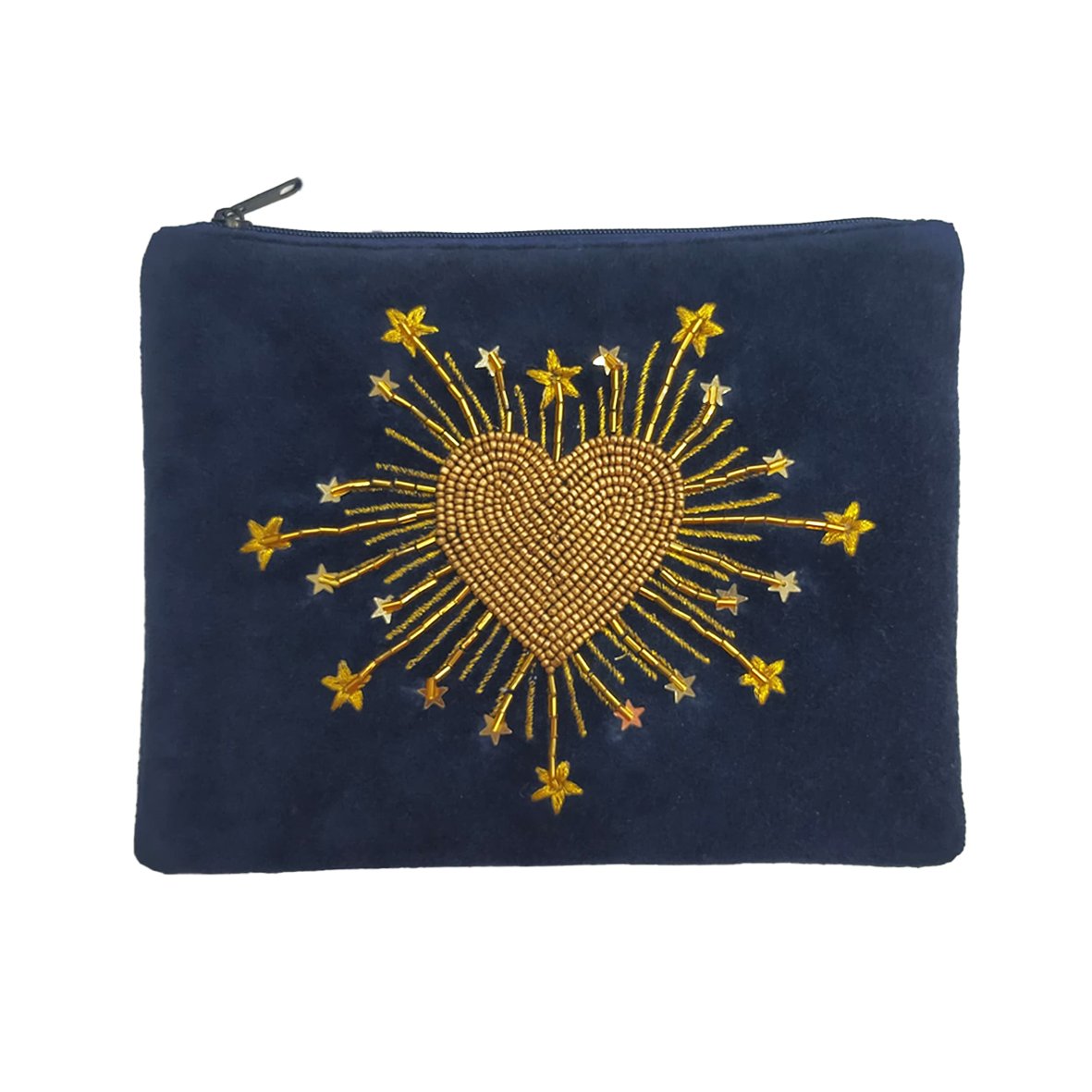 Pochette plate en très beau velours (100% coton) coloris bleu nuit (bleu très foncé, tirant sur le noir), brodée d’un motif ex-voto “coeur radieux” en perles de laiton, fil doré et étoiles en sequins.
