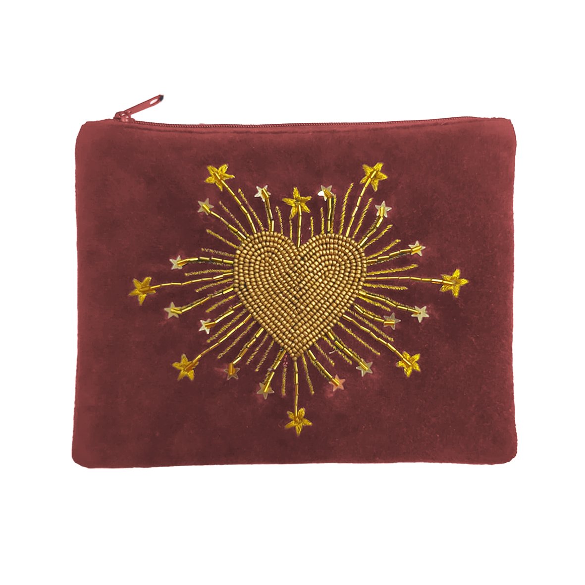 Pochette  plate en très beau velours  (100% coton)  coloris bois de rose, brodée d’un motif ex-voto “coeur radieux” en perles de laiton, fil doré et étoiles en sequins.