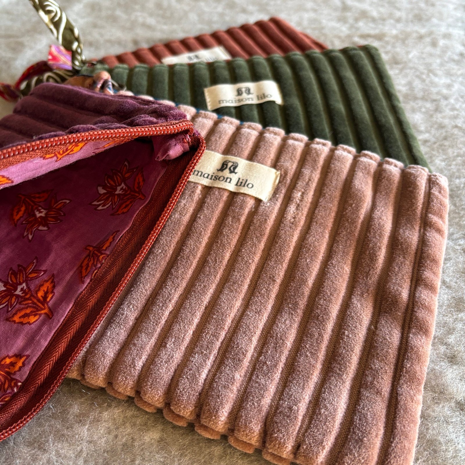 Superbe pochette plate en très beau velours côtelé (100% coton) doublée d’un tissu coton imprimé au tampon de bois.