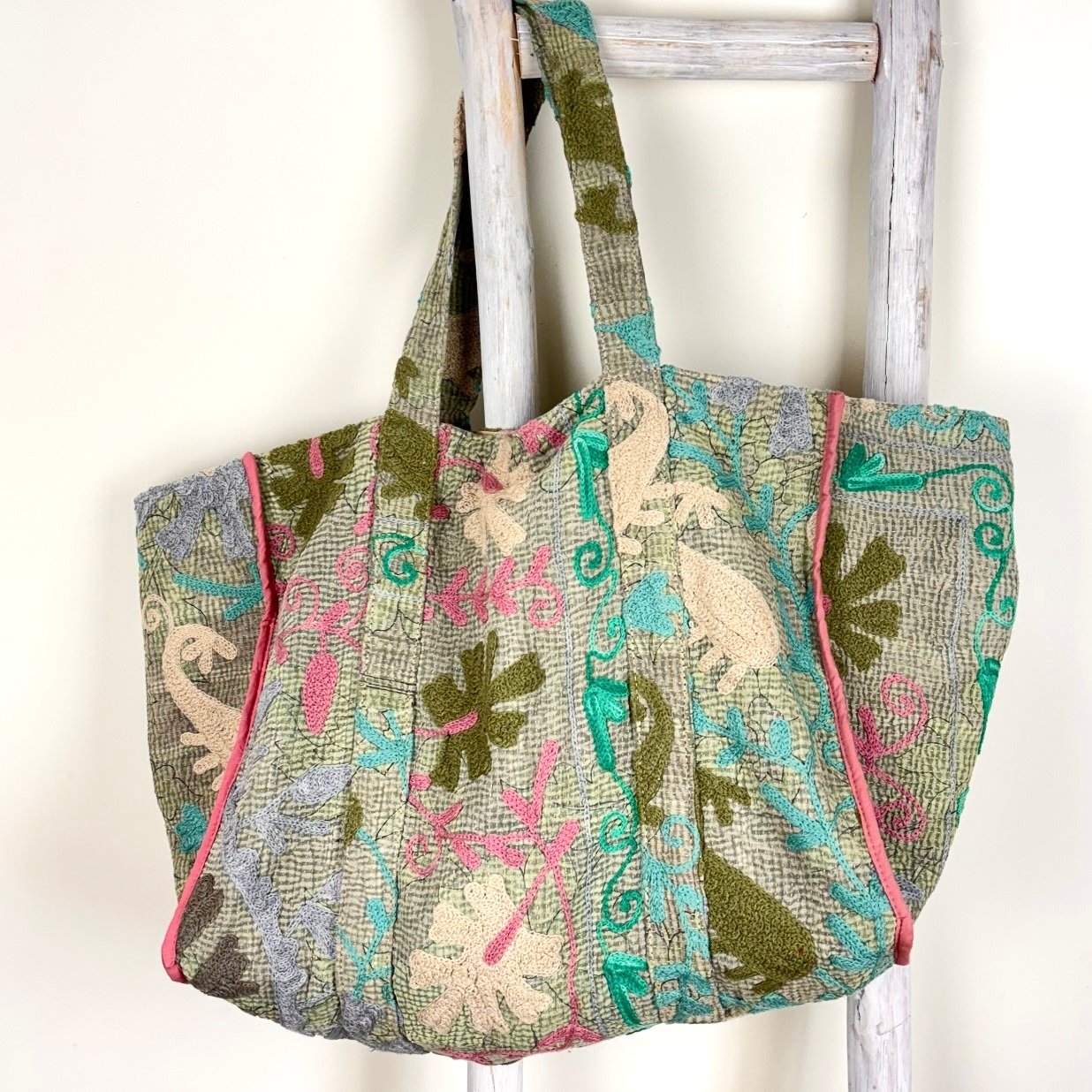 Le sac cabas Havana Kantha Vintage est une pièce artisanale unique, alliant la broderie traditionnelle Suzani et la technique du kantha (assemblage par surpiqûres manuelles de saris vintage upcyclés). Chaque pièce est totalement unique, aussi bien par son coloris de base (chaque sari utilisé étant différent) mais aussi par ses broderies qui ne sont jamais réalisées 2 fois à l’identique.
