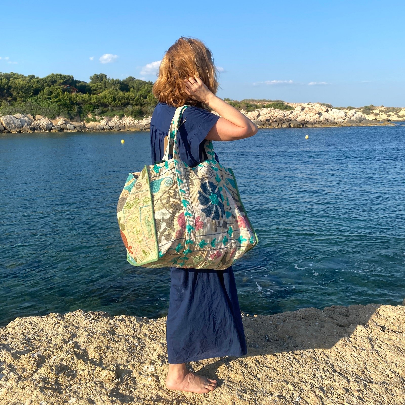 Le sac cabas Havana est une pièce artisanale unique, alliant la broderie traditionnelle Suzani et la technique du kantha (assemblage par surpiqûres manuelles de saris vintage upcyclés). Chaque pièce est totalement unique, aussi bien par son coloris de base (chaque sari utilisé étant différent) mais aussi par ses broderies qui ne sont jamais réalisées 2 fois à l’identique.