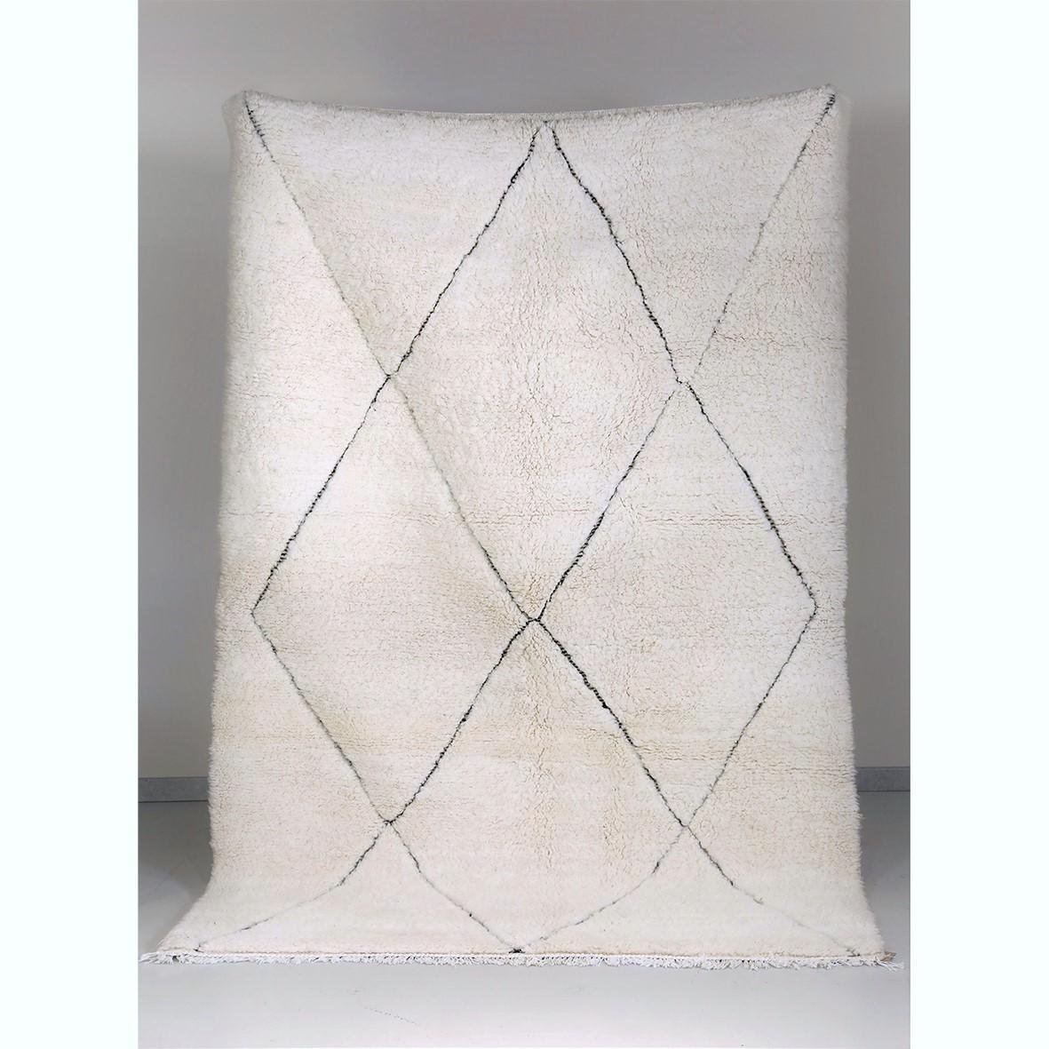Tapis Beni Ouarain épais, écru au motif de grands losanges noirs en creux dans la trame