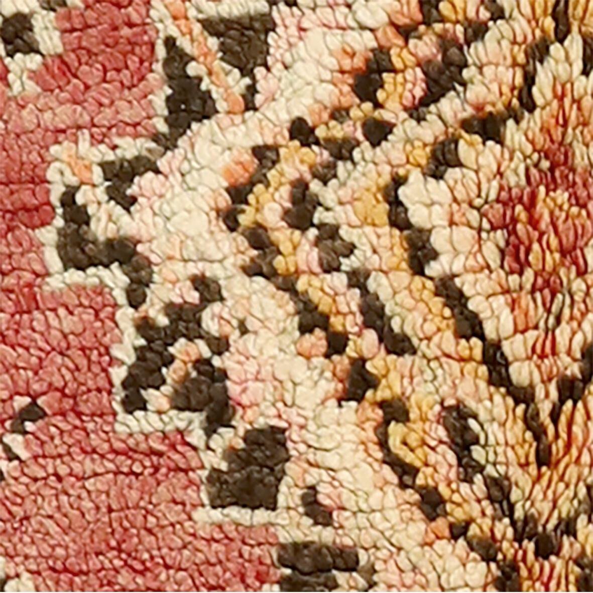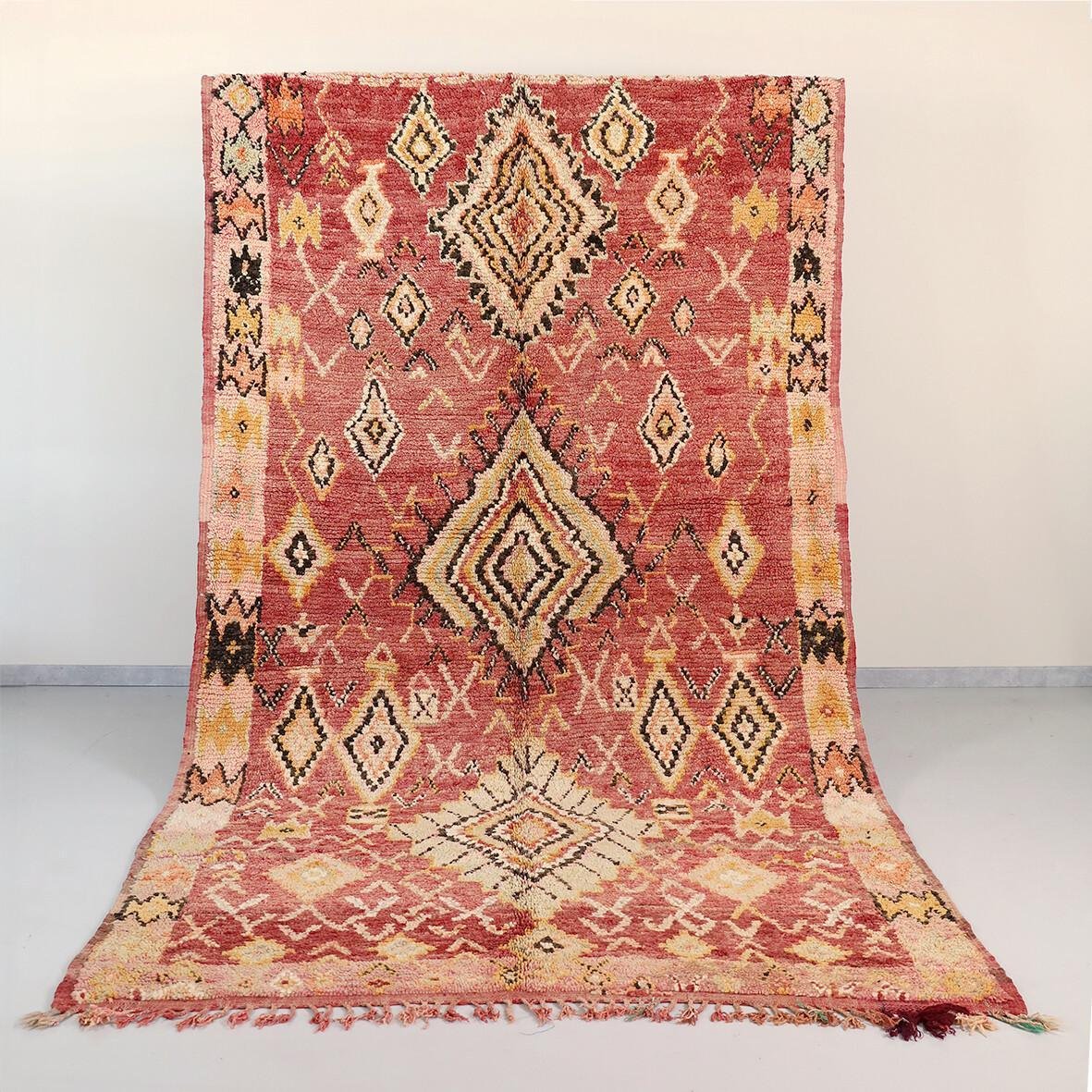 Magnifique Boujaad ancien (une cinquantaine d’années) dans des tons chauds terracotta/corail ponctués de motifs géométriques ocre, safran, saumon surlignés de noir.