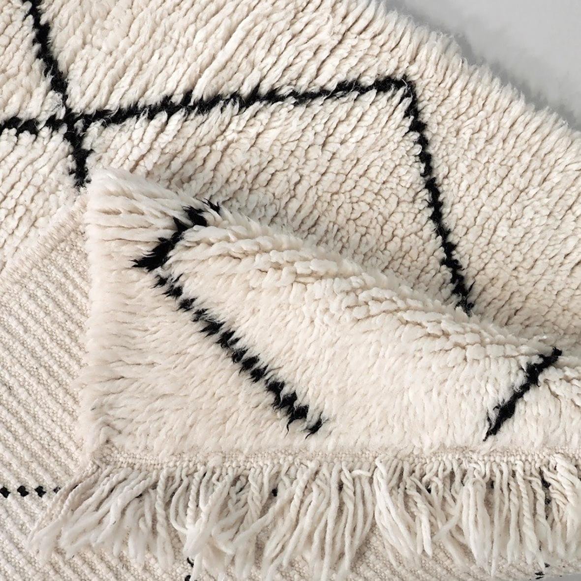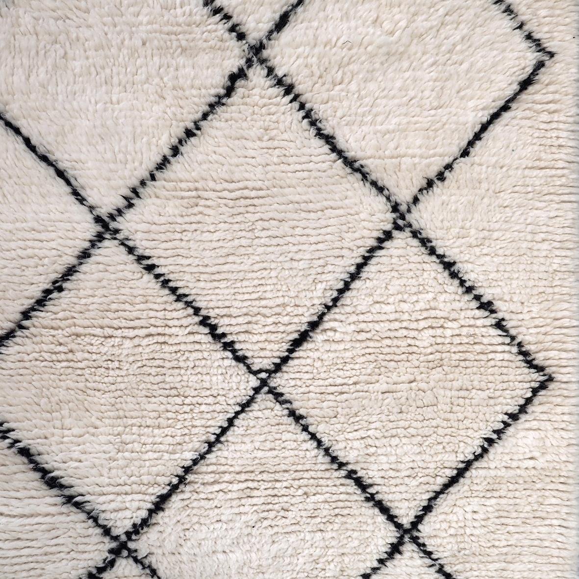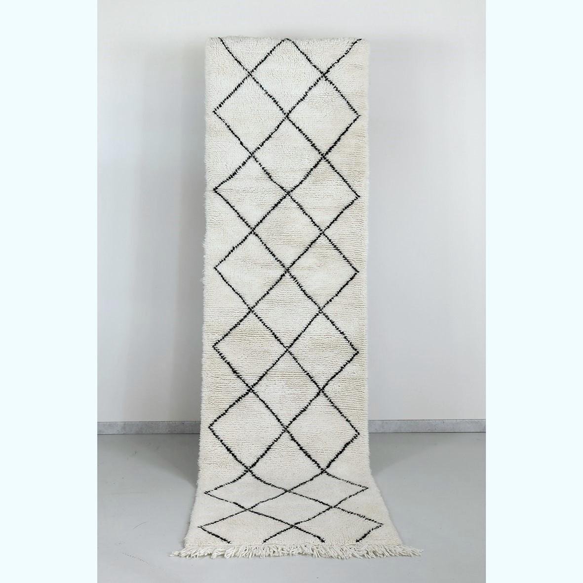 Superbe Beni Ouarain de couloir  à la laine particulièrement longue et soyeuse avec motif traditionnel  de losanges noirs pour un effet très graphique.