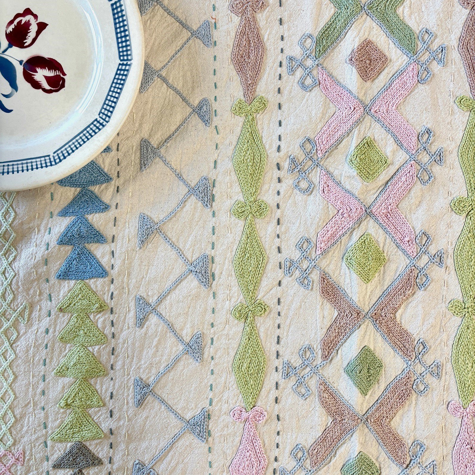 Magnifique tenture Suzani aux motifs géométriques traditionnels entièrement brodés à la main dans des couleurs pastels douces sur une toile de coton épaisse.