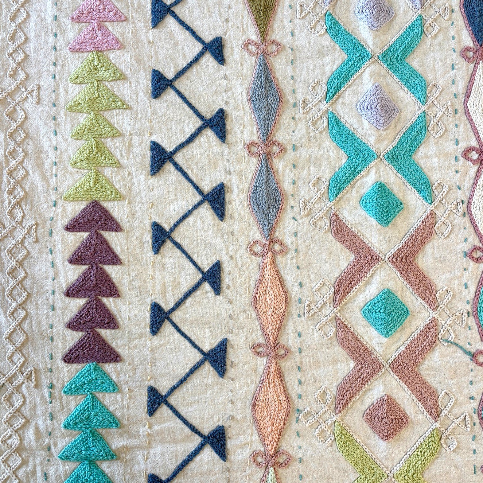 ;Splendide tenture en toile de coton épaisse entièrement brodée à la main de motifs géométriques multicolores Suzani et parcourue de surpiqûres de couleur réalisées à la main