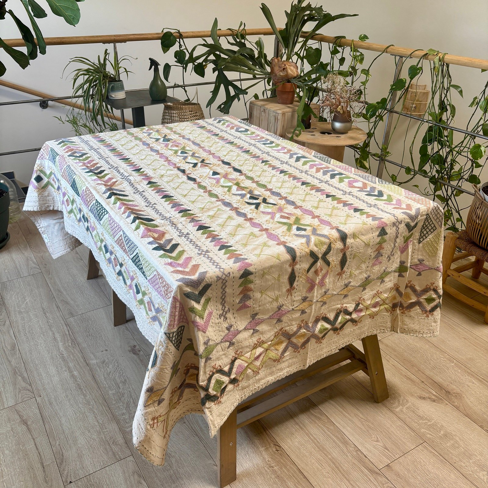 Splendide tenture en toile de coton épaisse entièrement brodée à la main de motifs géométriques dans des coloris très doux. En plus des broderies géométriques on retrouve également de belles lignes de surpiqûres réalisées entièrement à la main.