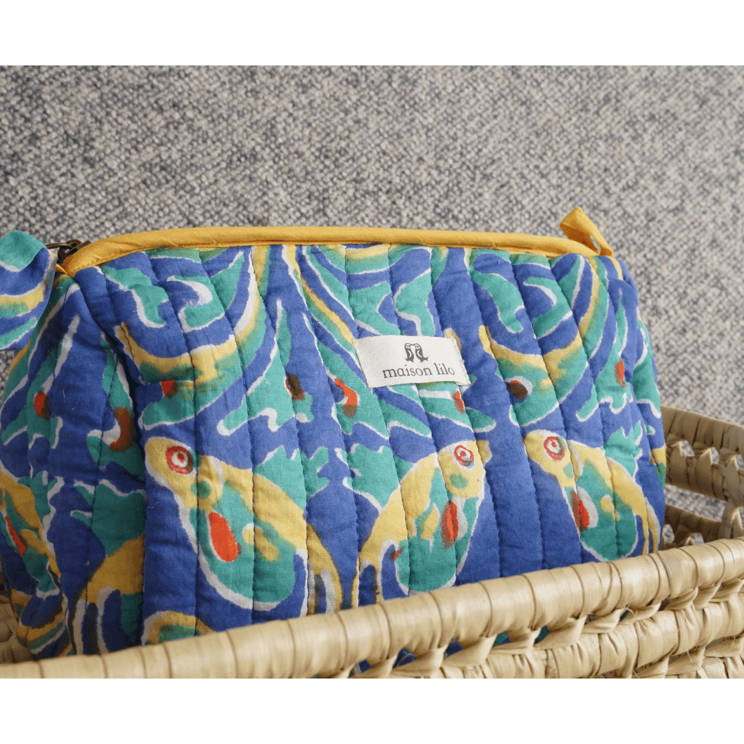 Trousses en coton imprimé artisanalement au tampon de bois d’un imprimé lumineux ‘à la Matisse” de poissons stylisés. Des couleurs qui font entrer le soleil dans la salle de bain !